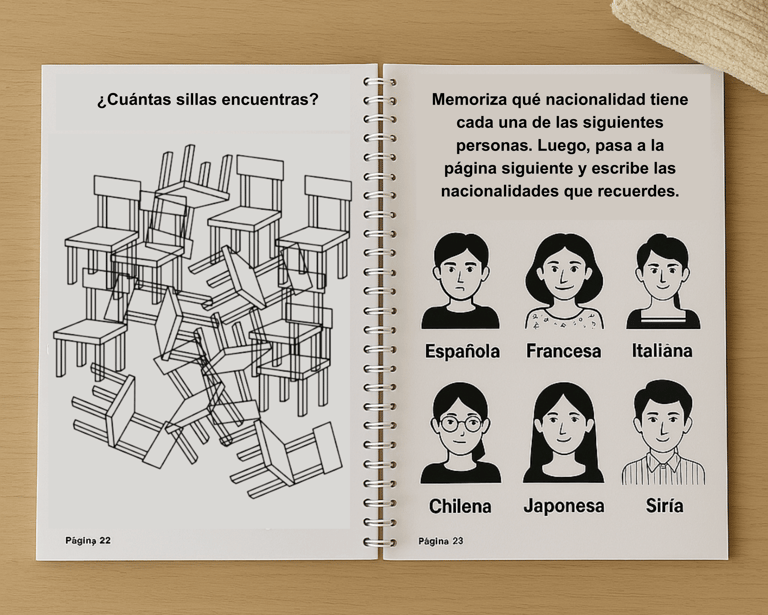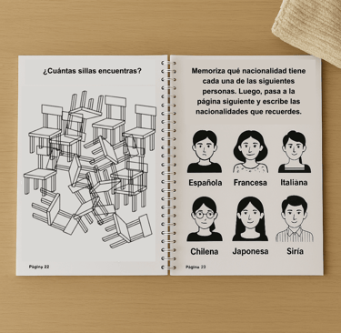 El cuaderno contiene ejercicios diseñados para estimular áreas clave como la memoria, la atención, la lógica y el lenguaje. Cada actividad está basada en principios neurocientíficos para garantizar una estimulación efectiva.